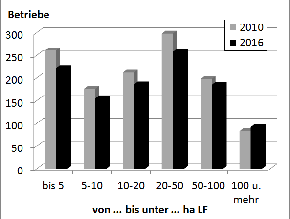 Parallel dazu sank der traditionell hohe Anteil von Haupterwerbsbetrieben wegen der für viele Betriebe nicht mehr ausreichenden Einkommensmöglichkeiten sehr stark ab und lag 2010 mit 39,5 % nur noch unwesentlich über dem Landesmittel (37,5 %).